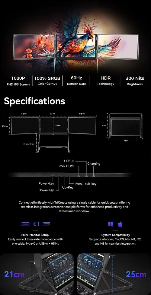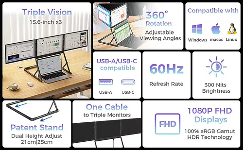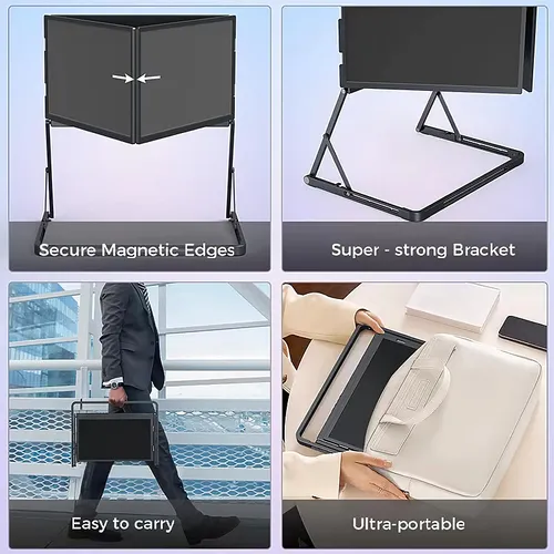 With a 3-fold design, it's slim and lightweight enough to fit in your backpack. It folds down to the size of a laptop and unfolds instantly into a large screen—doubling your view for spreadsheets, video editing, and gaming. Compatible with multiple devices, it offers instant big-screen enjoyment with plug-and-play. One Type-C cable for direct connection, super efficient for travel and split-screen office work.